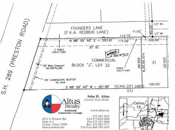 Preston Rd. @ Founders (Redbud E), Celina - 2 Acres - Possibly the best commercial lot along Hwy. 289 (Preston Rd) located in Celina. Great site for convenience store, strip shopping center, farm & ranch store, feed store, vet clinic, etc., located at entry to large new housing addition. MAPSCO CG 3F-3