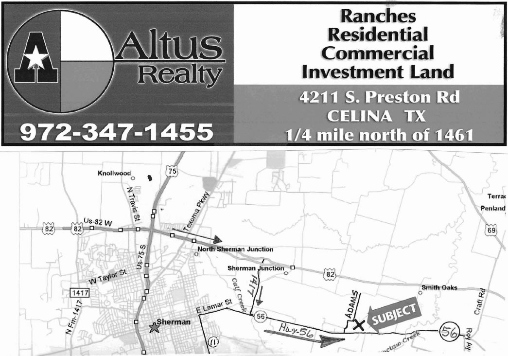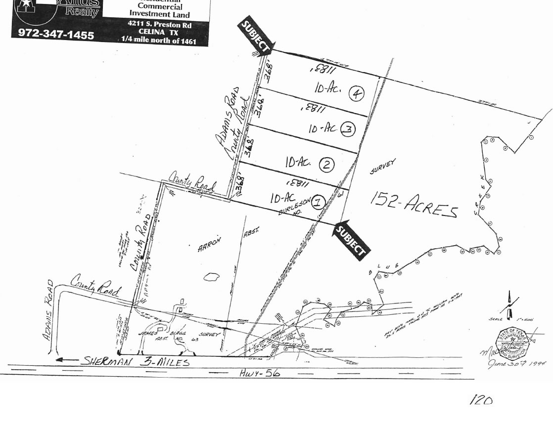 10-acre tract along Adams Road (off Hwy-56 east of Sherman) or the entire 110-acres for $7950/acre (go to site #115 for the entire tract). Only three miles east of Sherman city limits. Old German homestead with two ponds, several wells and loads of trees. This beautiful site has 1470+/- feet of Hwy-56 frontage along with additional frontage on two side roads (location of 10-acre sites). In August of 2006, the owner invested over $30,000 for clearing brush and cleaning the site. A great old setting for a new owner. $9450/acre- power and water will be available to tracts ..deed restricted #120/#211